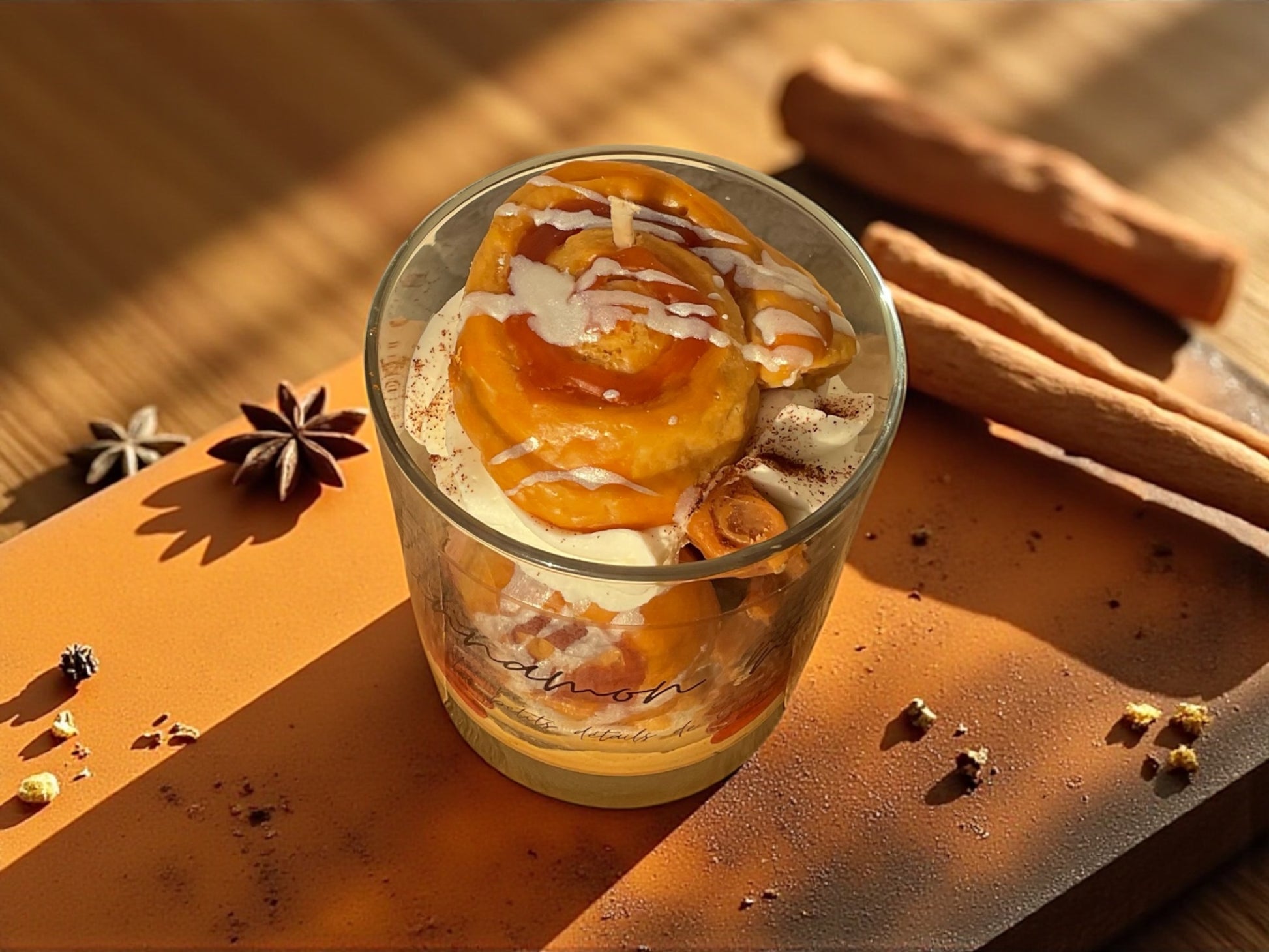 La bougie en forme de cinnamon roll est une vraie tentation visuelle et olfactive : un tourbillon réaliste de cire dorée, nappé d’un glaçage fondant, et une senteur chaleureuse mêlant cannelle, sucre glace et vanille crémeuse.