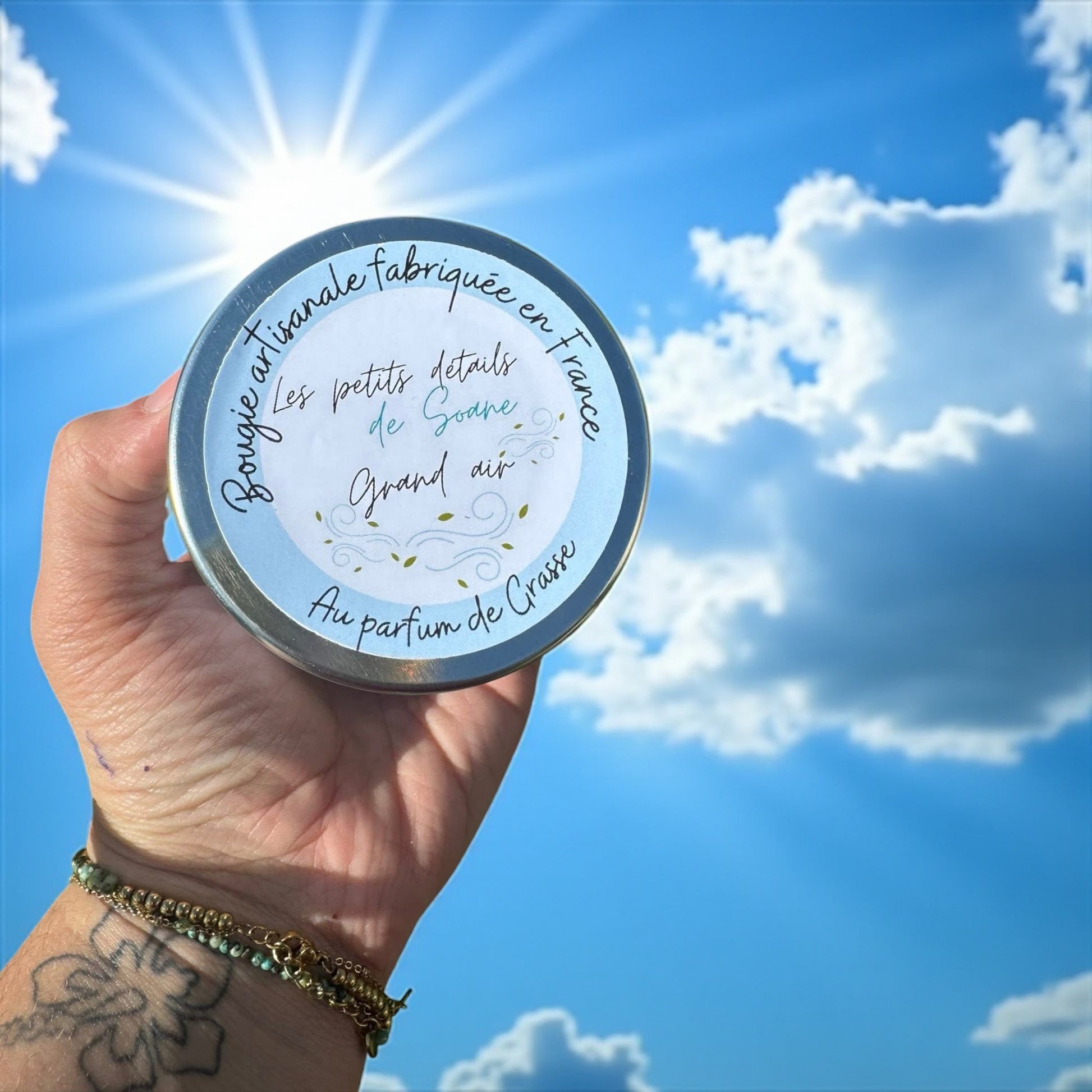 La bougie parfum "Grand Air" évoque la sensation de liberté et de fraîcheur, avec des notes aldéhydées, rosées, fruitées et florales. Insufflez une bouffée d'air frais dans votre environnement et profitez de ce moment de douceur dans lequel la nature est au rendez-vous.