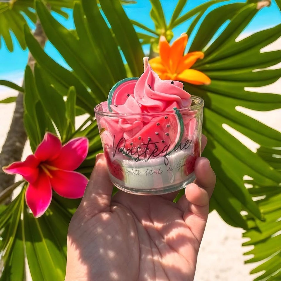 Découvrez la bougie parfumée à la pastèque, un parfum qui capture la fraîcheur juteuse de la pastèque avec des notes aqueuses, vertes, et fruitées. Cette bougie est idéale pour ceux qui cherchent à introduire une touche de légèreté et de fraîcheur estivale dans leur intérieur.