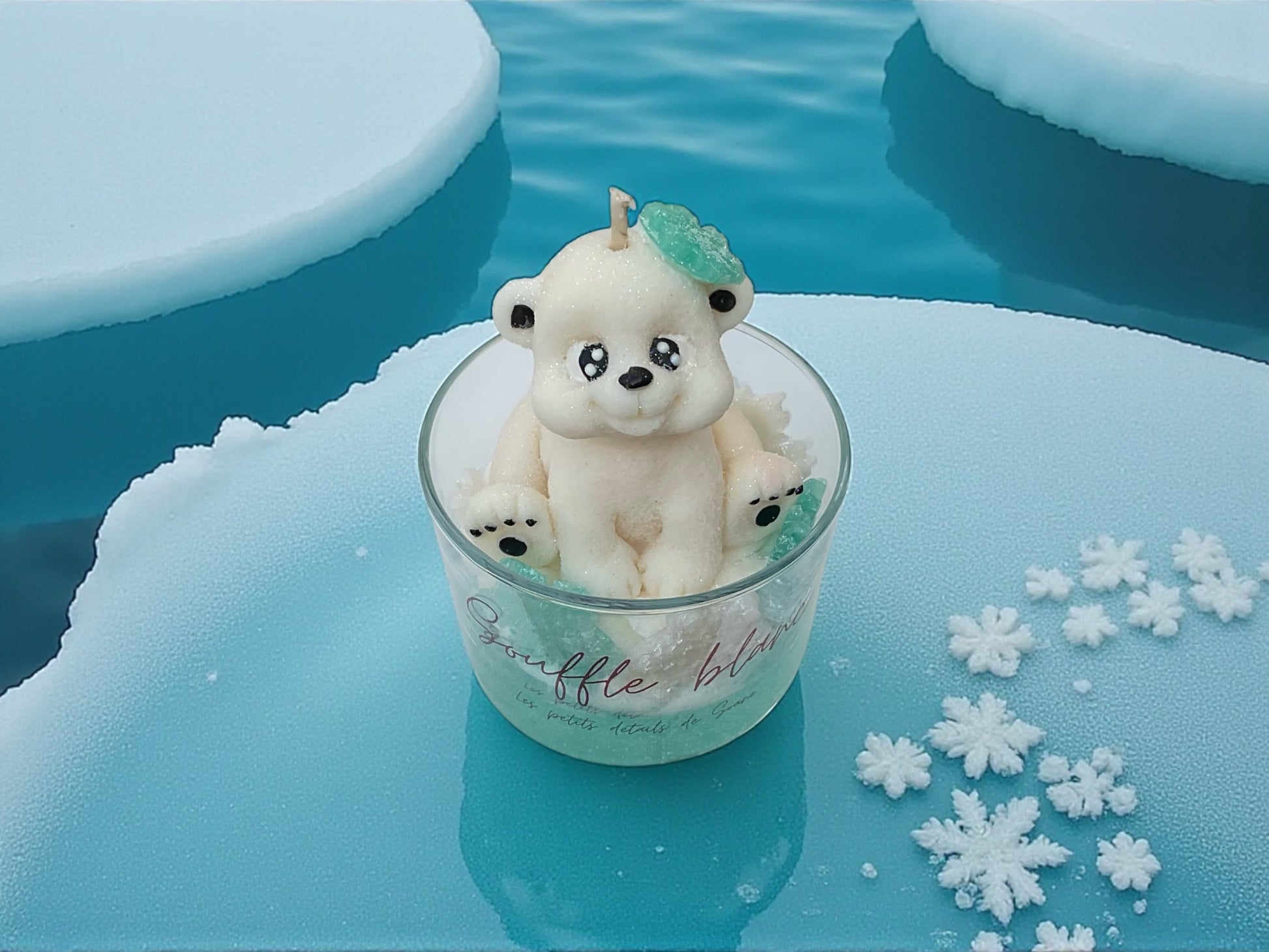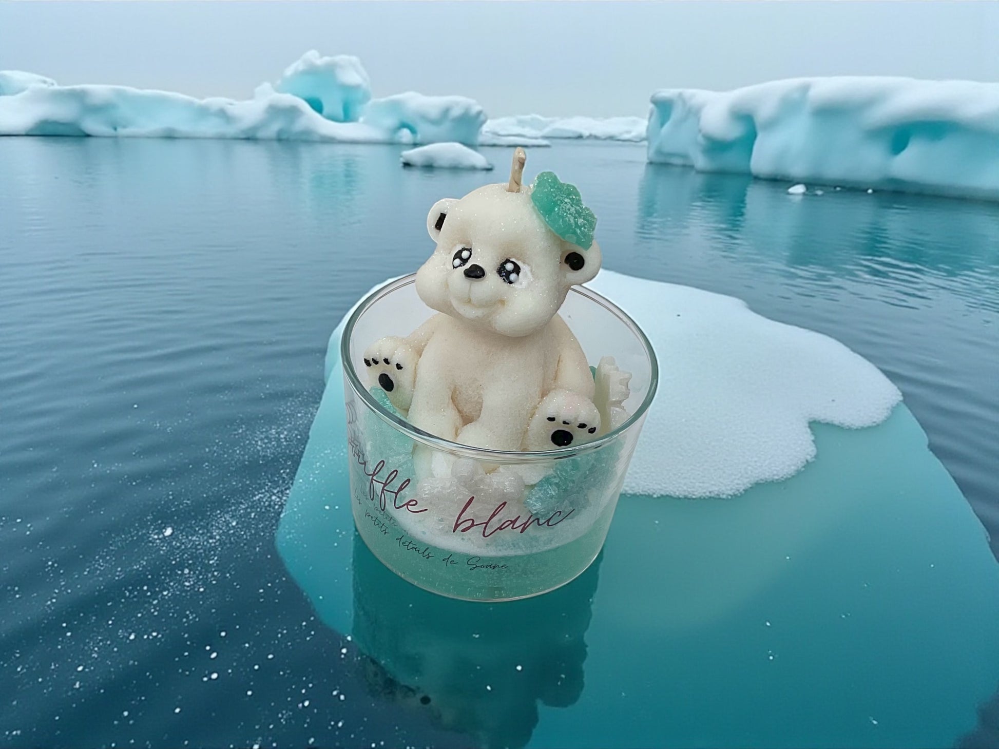 Dans un écrin de cire immaculée, un petit ours polaire sommeille, comme posé sur un nuage glacé.