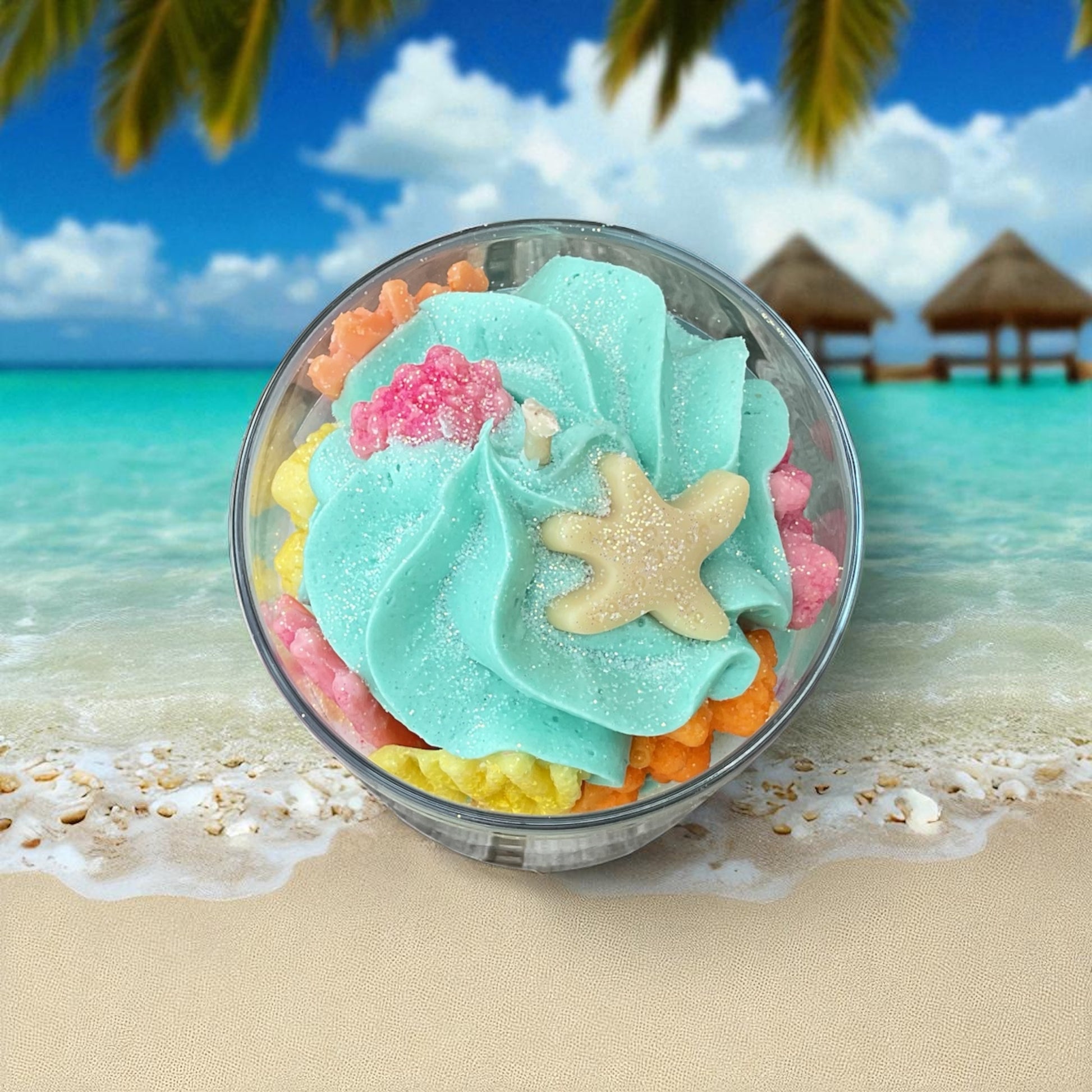 Une évasion tropicale vous attend avec cette bougie dans laquelle le fond est mobile. Comme une boule à neige, les coquillages et les perles se déplacent et suivent le mouvement de la bougie qui démarre sur des notes ensoleillées d'héliotrope et de fleur d'oranger. Le cœur floral révèle la tiaré en harmonie avec la fleur de bougainvillier, avant de se lover dans une base gourmande de vanille et de caramel.