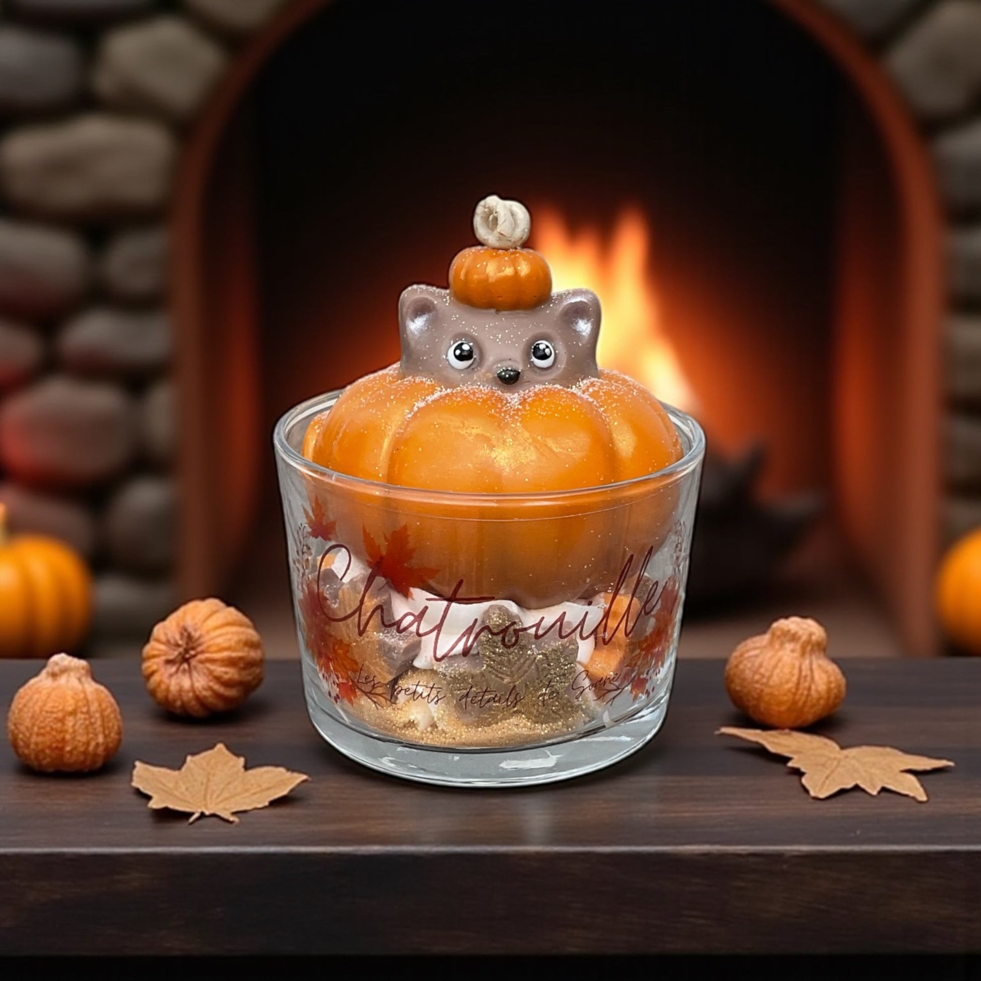 Bien au chaud dans sa citrouille, un petit chat malicieux vous observe de ses grands yeux brillants. Entre mystère et douceur, il apporte une touche de magie à vos soirées d’automne. Cette bougie est un concentré de cocooning aux airs d’Halloween, parfaite pour créer une ambiance chaleureuse, légèrement espiègle, et délicieusement réconfortante. Aussi, son parfum gourmand évoque un voyage sucré dans une cuisine dans laquelle les cookies sortent tout juste du four. Les notes de tête de beurre, de cacao et de caramel ouvrent la voie à un cœur chocolaté, soutenu par une base de vanille et d’accord lacté , évoquant une douce gourmandise sucrée.