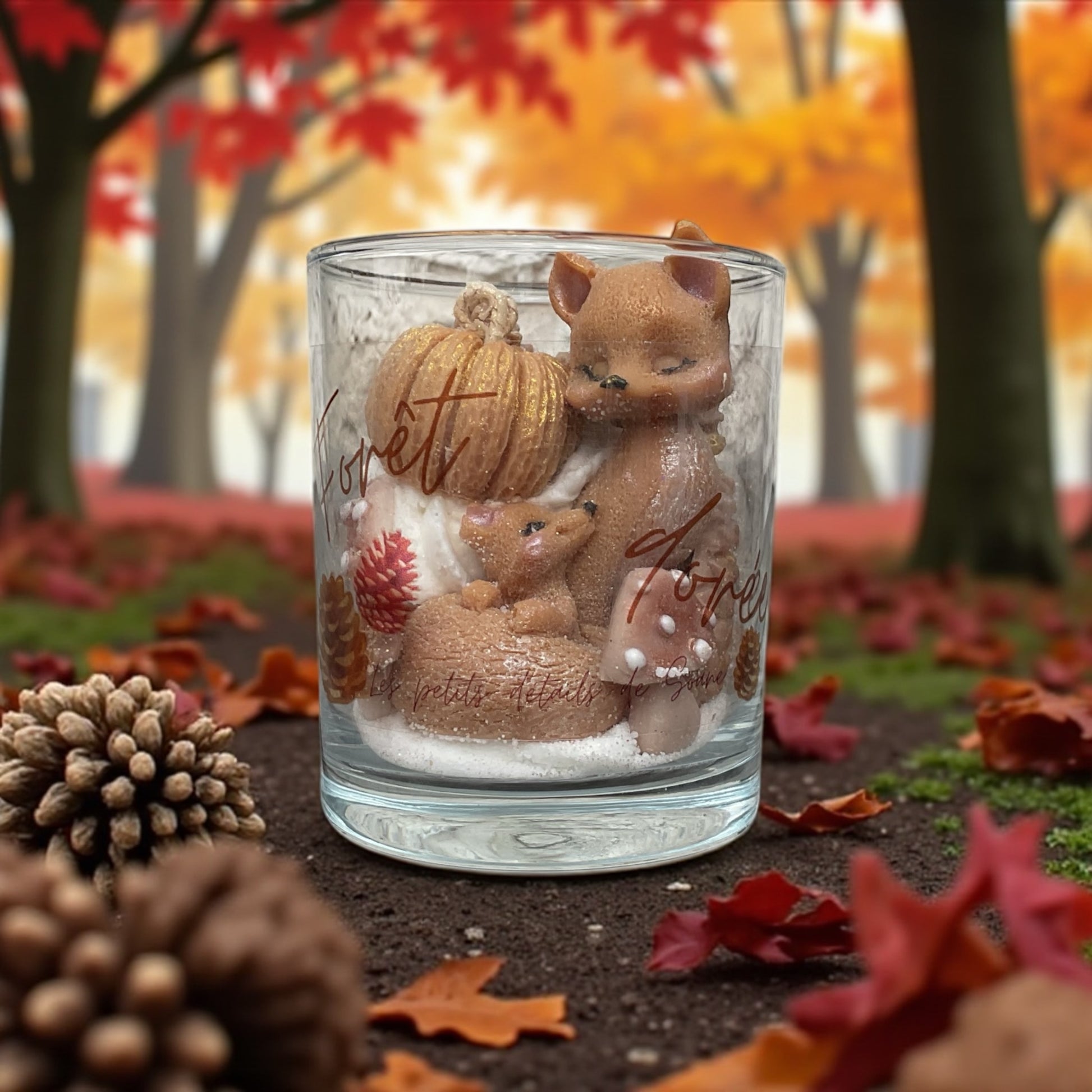 Blottis l’un contre l’autre, un renard et son petit se partagent un moment de douceur au cœur de la forêt. Cette scène pleine de tendresse et de complicité illumine votre bougie d’une chaleur naturelle et apaisante.