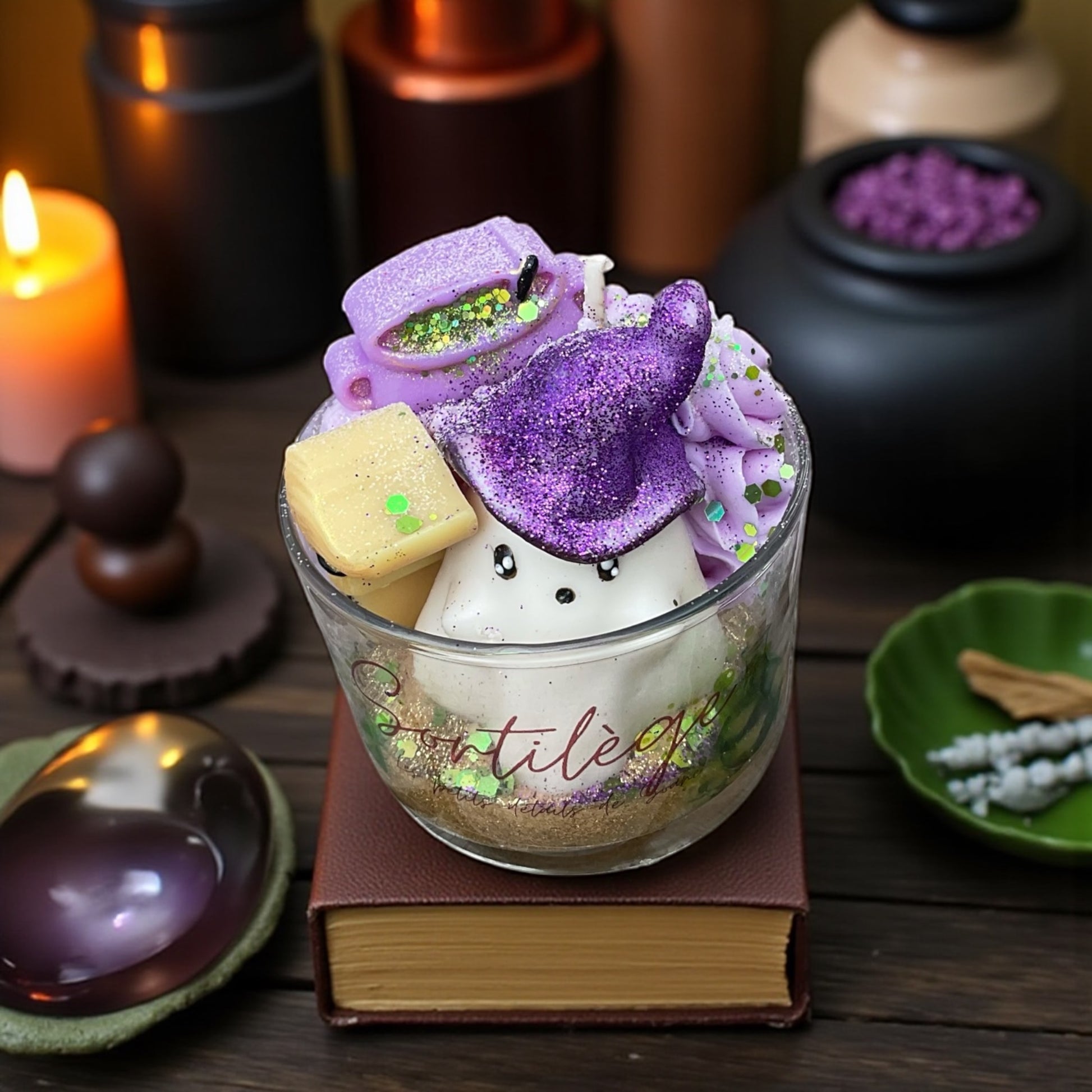 Dans la pénombre, un fantôme sorcier flotte doucement, sa cape flottante et son regard malicieux. Mystère, magie et un brin de malice se mêlent dans cette bougie qui invite à plonger dans un univers enchanté où les secrets des anciens sortilèges se dévoilent à la lueur de la flamme.